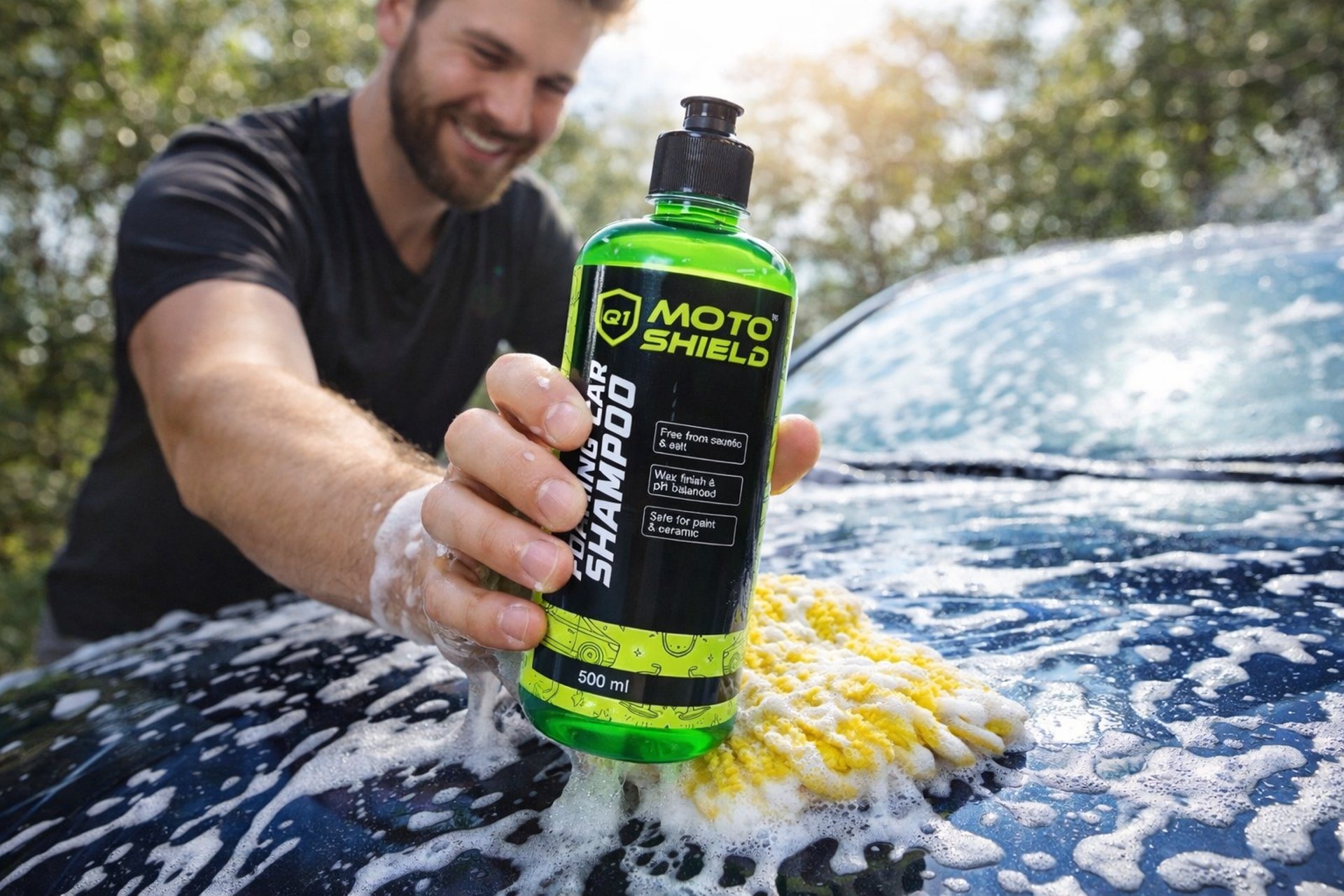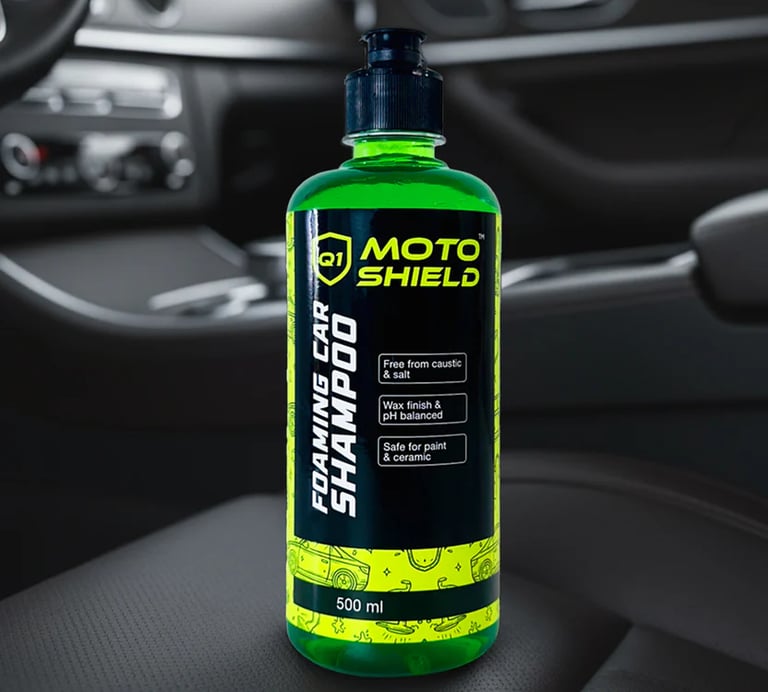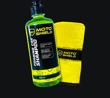 Includes: 500ml Moto Shield Foaming Car Shampoo and 1 Premium Microfiber Towel