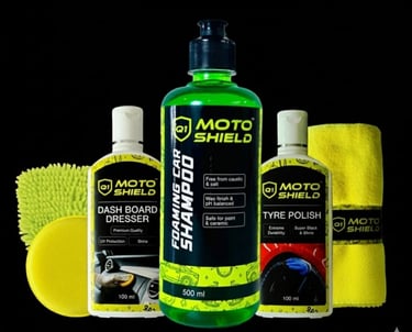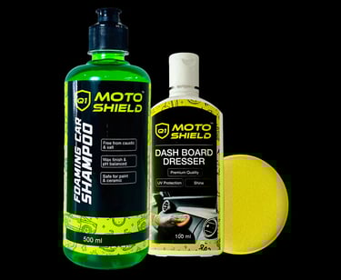 Includes: 500ml Moto Shield Foaming Car Shampoo, 100ml Dashboard Dresser, 1 Applicator Pad