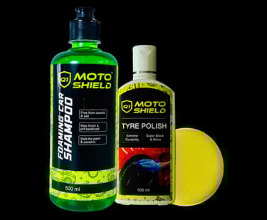 Includes: 500ml Moto Shield Foaming Car Shampoo, 100ml Tyre Polish, 1 Applicator Pad
